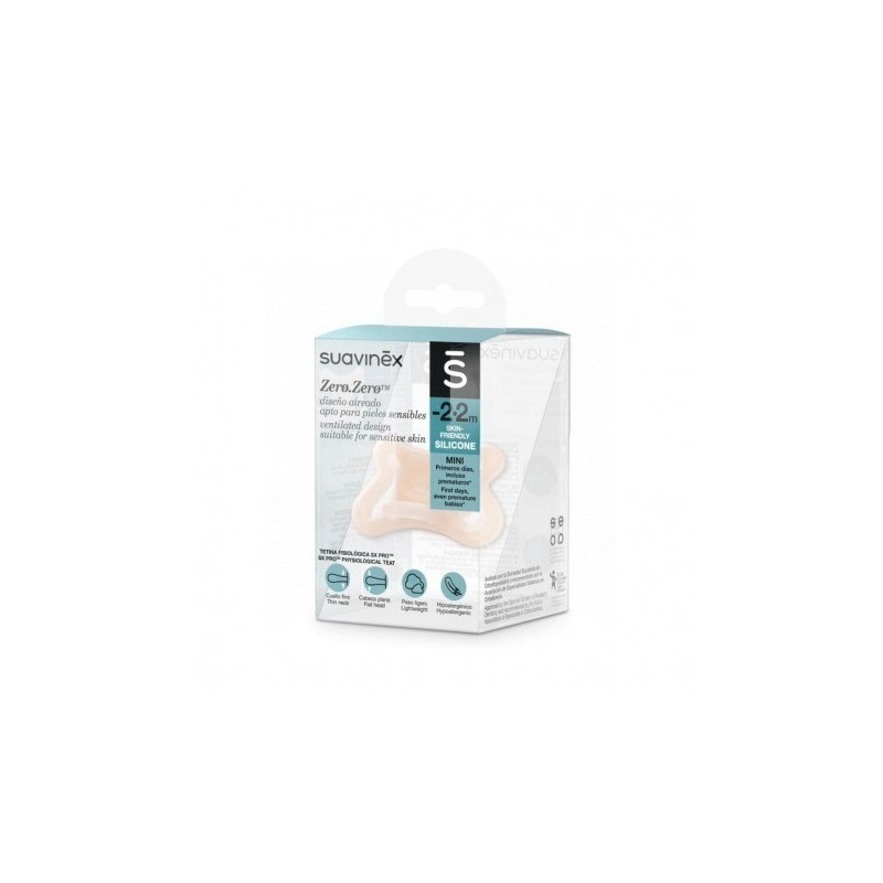 El chupete Zero Zero de Suavinex, con tetina de silicona, es perfecto para los primeros días del recién nacido y bebés prematuros. Su tetina simétrica imita la posición natural de la lengua durante la succión. La forma del cuello fino y la cabeza plana de la tetina respeta el desarrollo bucodental del bebé desde el primer día.
