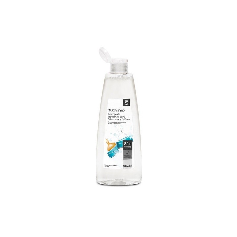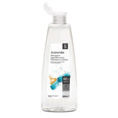 El detergente para biberones y tetinas de Suavinex limpia en profundidad los restos de leche, papilla y zumo, así como los restos de comida de la vajilla infantil (platos, tazas, cubiertos).