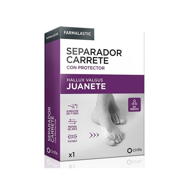 El Separador Carrete con Protector, para adultos, está indicado para personas que tienen juanete y dedos montados. Ayuda a alinear el primer dedo del pie evitando una superposición sobre los dedos contiguos. Evita la formación de rozaduras, callos y ampollas. Ayuda a aliviar el dolor del juanete provocado por el roce del calzado (fricción excesiva). El Separador Carrete con Protector del Gel Triblock está diseñado ergonómicamente para adaptarse al espacio entre el primer y segundo dedo del pie con facilidad. El gel es multidireccional, suave y flexible, eliminando la fricción entre los dedos al caminar. Cuenta con memoria de recuperación, vuelve a su forma inicial tras su uso. Se puede reutilizar. Apto para utilizar con calcetines, medias y calzado habitual.