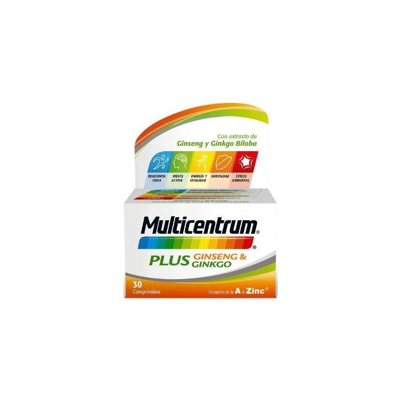 Complemento alimenticio con vitaminas, minerales, extracto de Ginseng y extracto de Ginkgo Biloba. Para adultos. MODO DE EMPLEO Tome un comprimido al día. PRECAUCIONES Y ADVERTENCIAS Es importante mantener una dieta variada y equilibrada además de un estilo de vida saludable. Los complementos alimenticios no deben ser usados como sustitutos de una dieta equilibrada. No superar la dosis diaria recomendada. El ginkgo biloba puede afectar a la coagulación sanguínea. Las personas con tendencia a las hemorragias debido a alguna enfermedad y los pacientes que utilicen medicamentos anticoagulantes deben consultar a su médico antes de tomar este producto. Si está embarazada o en el periodo de lactancia, debería consultar con su médico o farmacéutico antes de empezar a tomar este producto. USO EN PACIENTES CON INTOLERANCIA ALIMENTARIA Este producto lo puede tomar una persona celíaca, alérgica/intolerante al huevo, o intolerante a la leche.