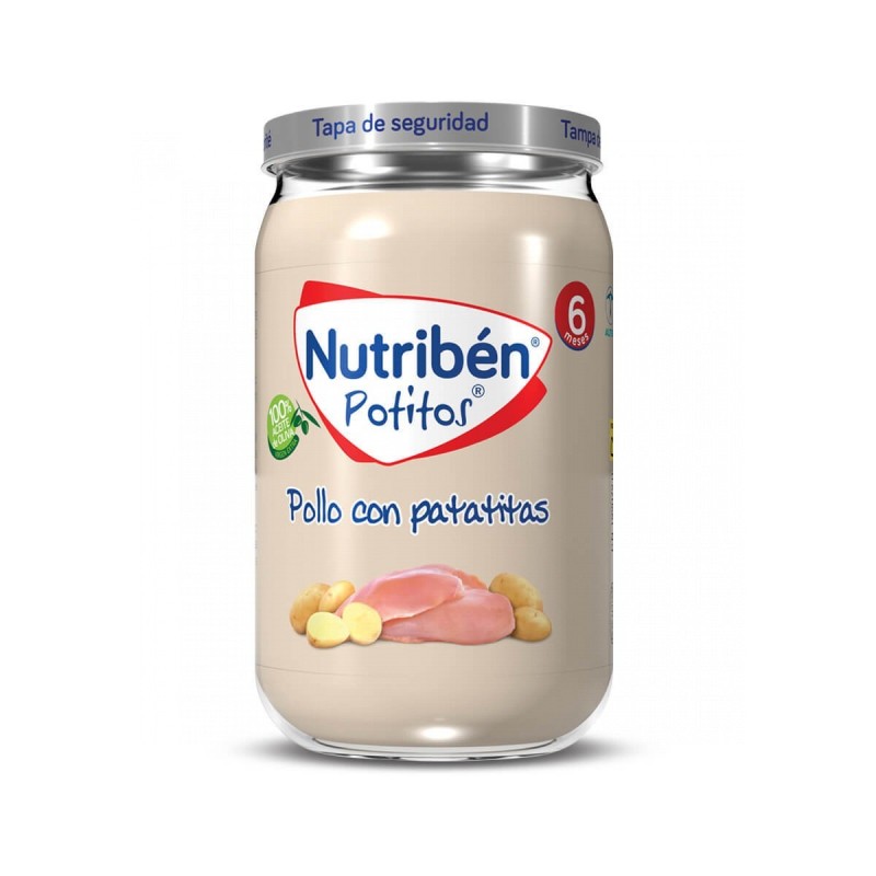 Información del producto / Regulación Nutribén Potitos® Pollo con patatas es un alimento infantil destinado a niños a partir del 6º mes de edad. Fabricado por Alter Farmacia S. A., Mateo Inurria, 30, 28036 Madrid (España). Nutribén Potitos® Pollo con patatas cumple con los estándares de composición establecidos por la FAO (ONU) en el Codex Alimentarius para preparados alimenticios complementarios para lactantes de más edad y niños pequeños, y es producido con los ingredientes y nutrientes abajo indicados. El producto cumple con el Reglamento 609/2013 relativo a los alimentos destinados a lactantes y niños de corta edad, los alimentos para usos médicos especiales y los sustitutivos de la dieta completa para el control de peso. Nutribén Potitos® Pollo con patatas cumple toda la legislación europea relativa a pesticidas, residuos, sustancias tóxicas y perjudiciales. Listado de ingredientes en orden decreciente Agua de cocción Pollo 15% Patatas 11% Arroz Almidón de maíz Aceite de oliva virgen extra 0,5% Cebolla Zumo de limón.