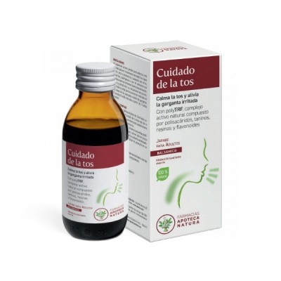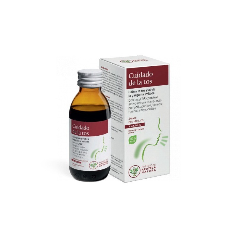 «Cuidado de la tos» jarabe para adultos actúa gracias al complejo vegetal polyTRF, compuesto por polisacáridos, taninos, resinas y flavonoides, con doble acción: